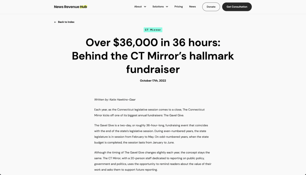 News Revenue Hub published a detailed feature on my work to create The Gavel Give at The Connecticut Mirror, interviewing me after my second successful campaign concluded in the summer of 2022.