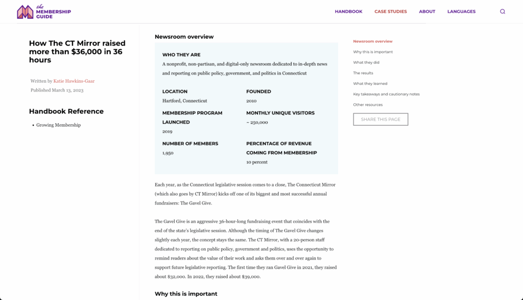 The Membership Puzzle Project published an in-depth breakdown of The Gavel Give — my signature fundraising event at The Connecticut Mirror — in one of its final case studies created for The Membership Guide in 2023.